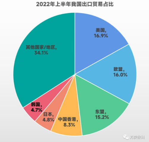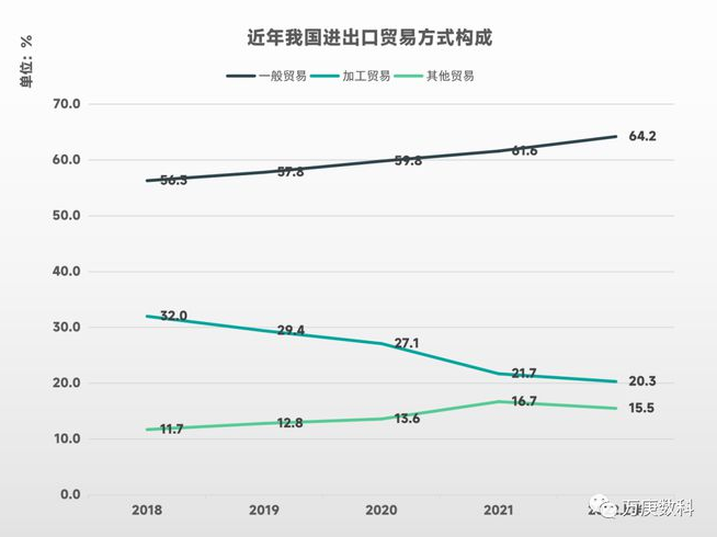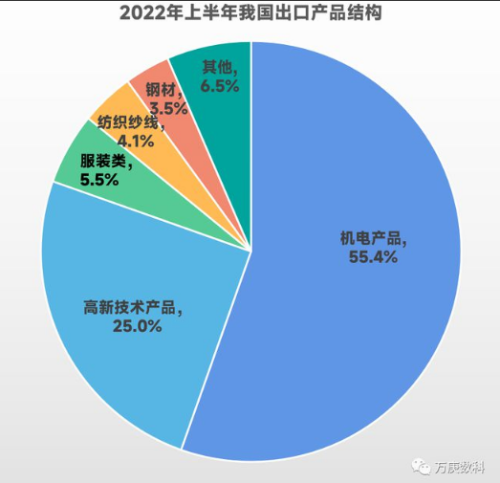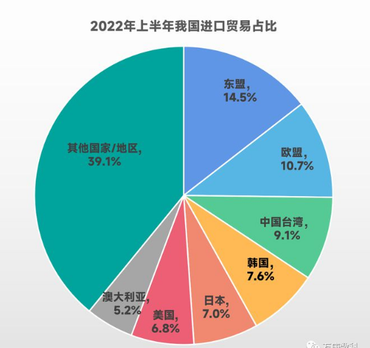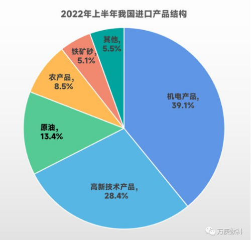 從我國2022年上半年進口貿(mào)易國家/地區(qū)占比來看,主要來源為東盟、歐盟、中國臺灣,韓國、日本、美國、澳大利亞也為重要構(gòu)成。從出口貿(mào)易國家/地區(qū)占比來看,美國、歐盟、東盟是我國出口貿(mào)易的主要對象,中國香港、日本、韓國也為重要組成部分。 不難發(fā)現(xiàn),美國、歐盟、東盟、日本、韓國五個國家/地區(qū),在我國進出口貿(mào)易中皆占據(jù)重要份額。這表明我國當前外貿(mào)交易市場有一定集中度,存在區(qū)域失衡的跡象。但不可忽視的是,隨著我國進出口貿(mào)易額在全球貿(mào)易總額占比的逐步提高,越來越多的國家和市場將成為我國新的重要外貿(mào)交易對象。例如,上半年我國對印度、巴西、澳大利亞等經(jīng)濟體的出口額增速達到20%以上,對“一帶一路”沿線國家的出口額增速達到17.8%。預(yù)示著未來我國進出口貿(mào)易市場將更加多元化。 5、我國進出口產(chǎn)品結(jié)構(gòu)。 從2022年上半年我國產(chǎn)品進口結(jié)構(gòu)來看,機電產(chǎn)品最高,為39.1%;其次為高新技術(shù)產(chǎn)品,達28.4%;接著為原油、農(nóng)產(chǎn)品、鐵礦砂,三者分別為13.4%、8.5%、5.1%。這表明我國對技術(shù)類產(chǎn)品的外部需求較大,對能源、糧食、工業(yè)原料的進口也有一定程度的依賴。 從2022年上半年我國產(chǎn)品出口結(jié)構(gòu)來看,機電產(chǎn)品仍最高,但比例來到了55.4%之多;其次為高新技術(shù)產(chǎn)品,較進口占比略低,為25%;服裝、紡織紗線、鋼材分別為5.5%、4.1%、3.5%。這表明我國出口產(chǎn)品中以工業(yè)制品為主,但其中高新技術(shù)產(chǎn)品占比并不高,出口貿(mào)易結(jié)構(gòu)有待進一步優(yōu)化。 6、進出口貿(mào)易方式構(gòu)成。 自2018年以來,我國一般貿(mào)易占進出口貿(mào)易額比重穩(wěn)步升高,從56%提升至64%;加工貿(mào)易占比則持續(xù)下降,從32%將至20%;其他貿(mào)易(以服務(wù)貿(mào)易為主)占比整體來看有所升高,但今年略有下降。這表明低附加值的加工貿(mào)易正加速轉(zhuǎn)變?yōu)橐话阗Q(mào)易和服務(wù)貿(mào)易,我國進出口貿(mào)易方式持續(xù)優(yōu)化,但同時服務(wù)貿(mào)易的占比有待進一步提高。 7、進出口貿(mào)易額前十省份。