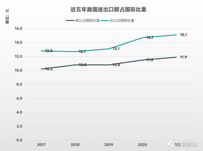 近五年來,國際進出口貿(mào)易總額呈現(xiàn)“升-降-升”的走勢,整體仍保持上升趨勢。但值得注意的是,2020年國際進口貿(mào)易額與出口貿(mào)易額降至2017年前水平,與我國當年的進出口貿(mào)易額變動相比,其下降幅度略高。這表明,我國的進出口貿(mào)易具有較強勁的韌性,面對國際貿(mào)易各參與國之間發(fā)展不平衡、政策多樣性等影響因素,更容易保持較穩(wěn)定的進口吸納與出口輸出能力,實現(xiàn)長期平穩(wěn)增長的發(fā)展態(tài)勢。 3、我國進出口額占國際進出口總額比重。