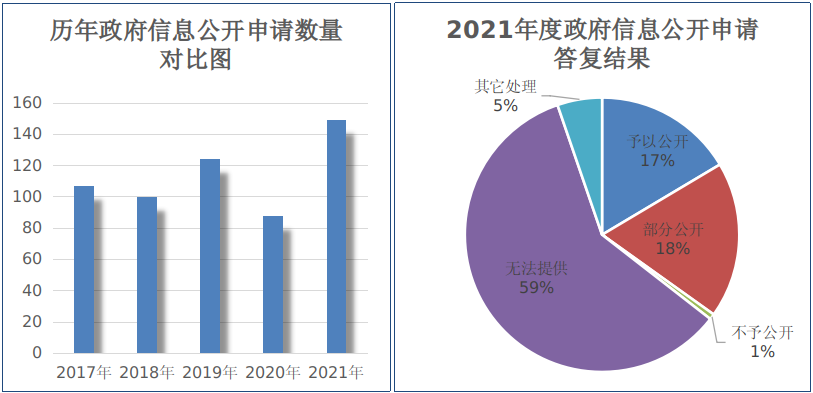 (二)依申請公開情況。2021年度,我機關(guān)辦理以及代市政府辦理政府信息公開申請149件,同比增長69.32%。其中自然人申請148件,商業(yè)企業(yè)申請1件。申請內(nèi)容主要集中在集體土地征地、國有土地上房屋征收、城鄉(xiāng)規(guī)劃、社會保障等領(lǐng)域。共作出政府信息公開申請答復(fù)書152件(含上年結(jié)轉(zhuǎn)3件),其中予以公開25件,占16.45%;部分公開28件,占18.42%;不予公開1件,占0.66%;無法提供90件,占59.21%;其它處理8件,占5.26%。